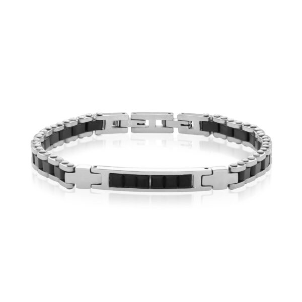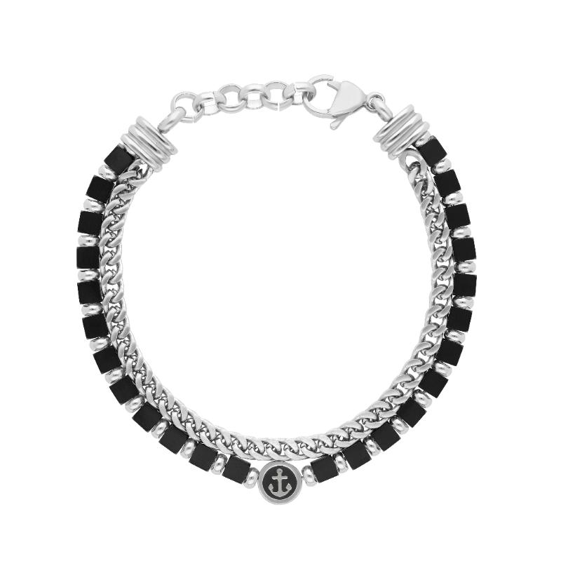 צמיד גברי בעיצוב ייחודי המשלב שרשרת חוליות כסופה עם אלמנטים שחורים מודגשים וסמל עוגן מרכזי. המראה המחוספס והמדויק מעניק סטייל אורבני מודרני עם נוכחות חזקה – שילוב מושלם בין אופנה לאופ