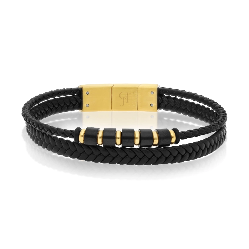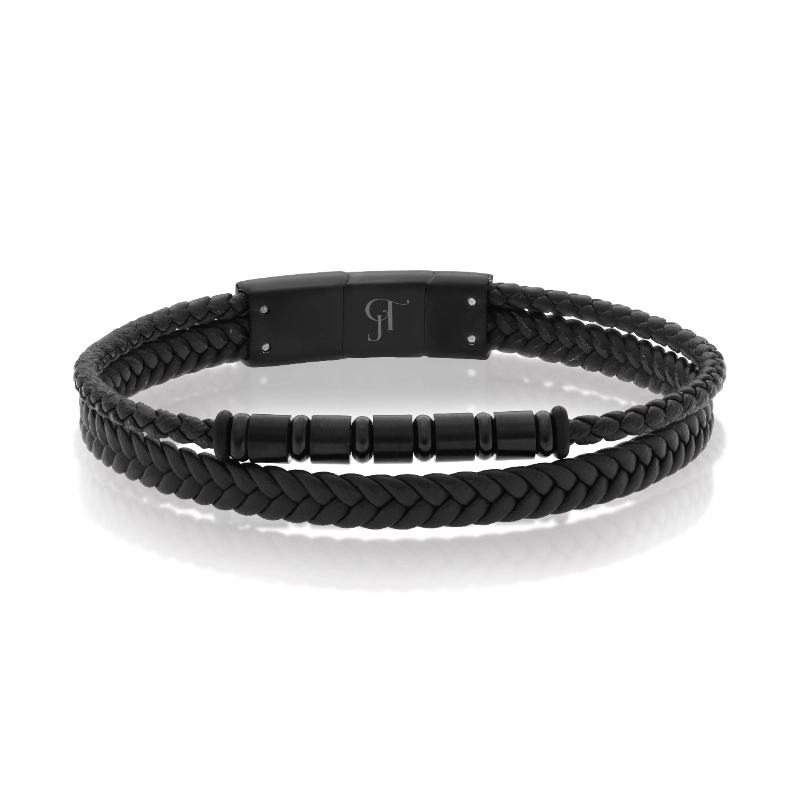 צמיד עור קלוע לגבר בעיצוב עוצמתי ומדויק, המשלב שתי רצועות עור קלוע איכותי עם אלמנטים מתכתיים בגימור חלק ומודרני.