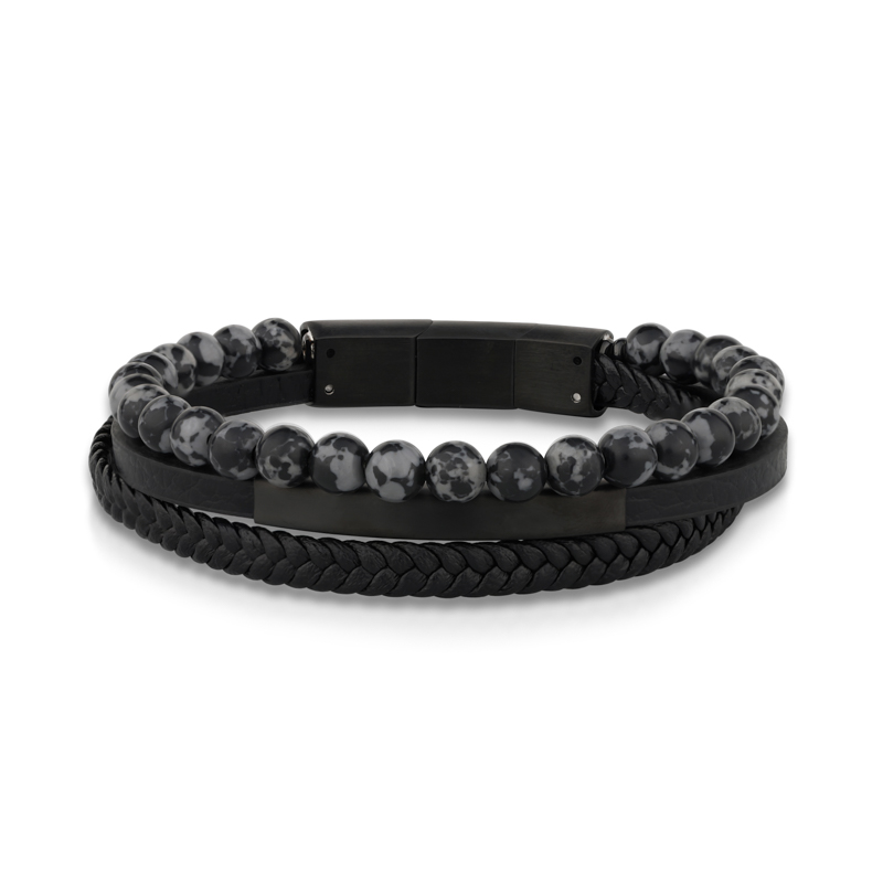 צמיד לגבר עשוי עור בצבע שחור מעוצב 3 שורות ,