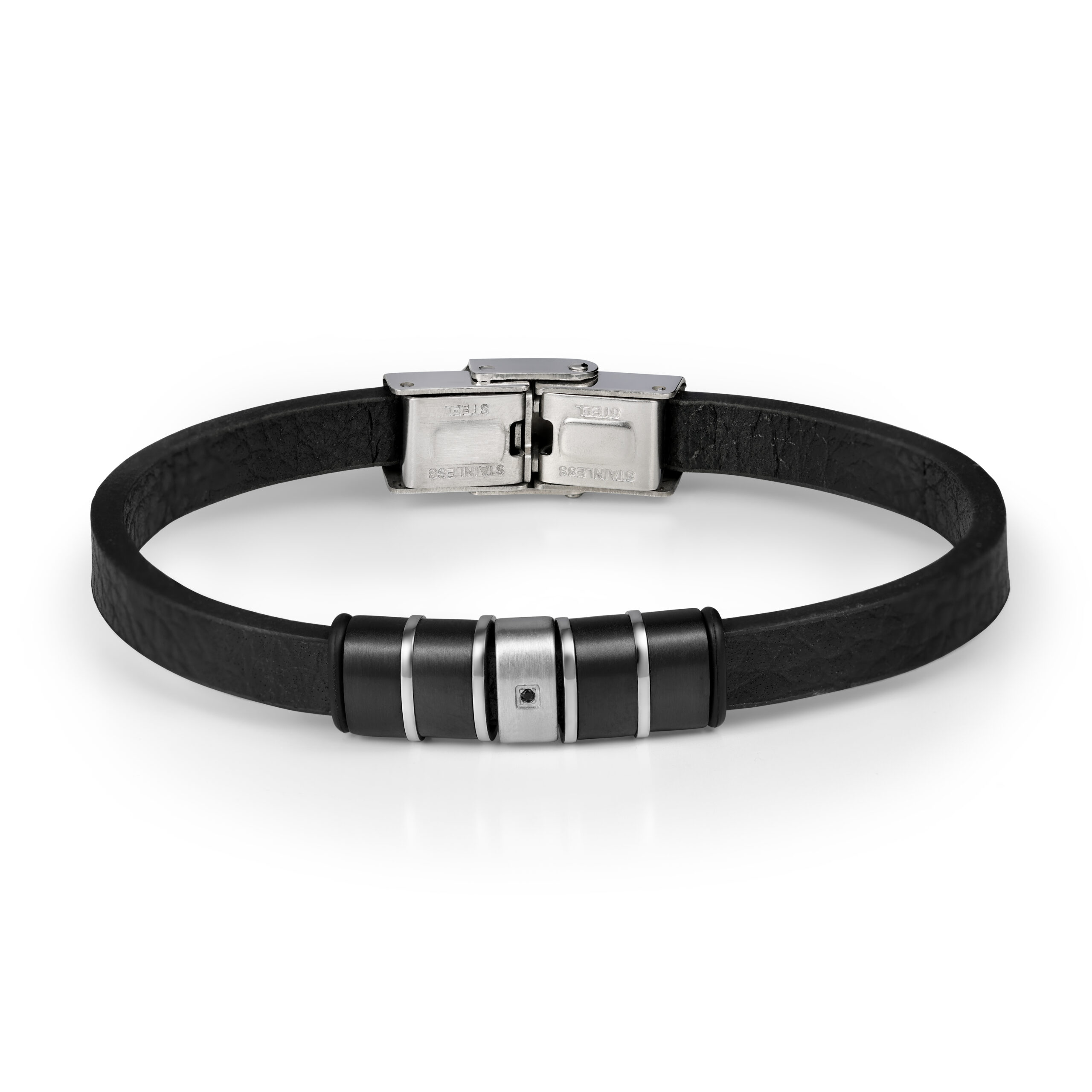 ✨ עיצוב ייחודי ומתוחכם צמיד עור שחור עם שילוב של אלמנטים מתכתיים בגוונים של כסף ושחור. מתאים לשדרוג כל לוק יום-יומי או ערב.