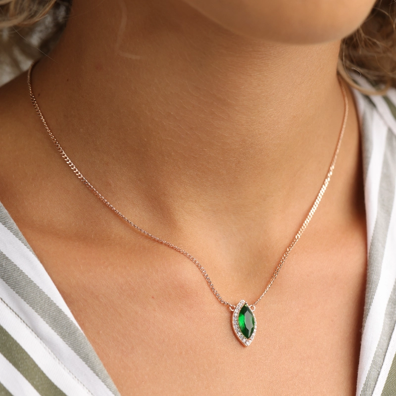 שרשרת כסופה בציפוי רוזגולד אלגנטי , המעוטרת בתליון מרהיב עם אבן חן בגוון אמרלד ירוק , המסמלת שפע ואנרגיה חיובית. מסגרת התליון משובצת באבני זירקון נוצצות למראה זוהר ויוקרתי.