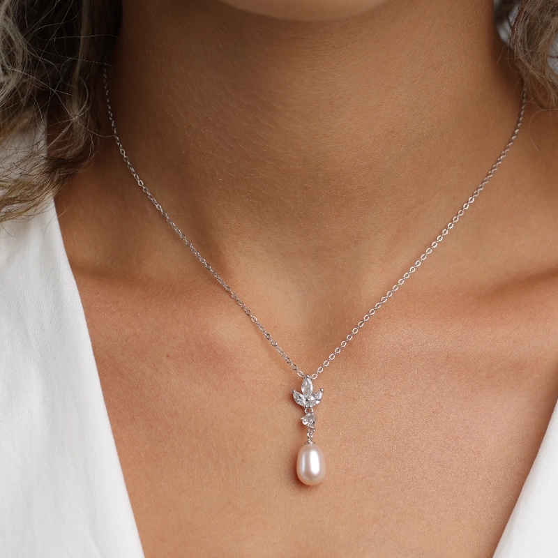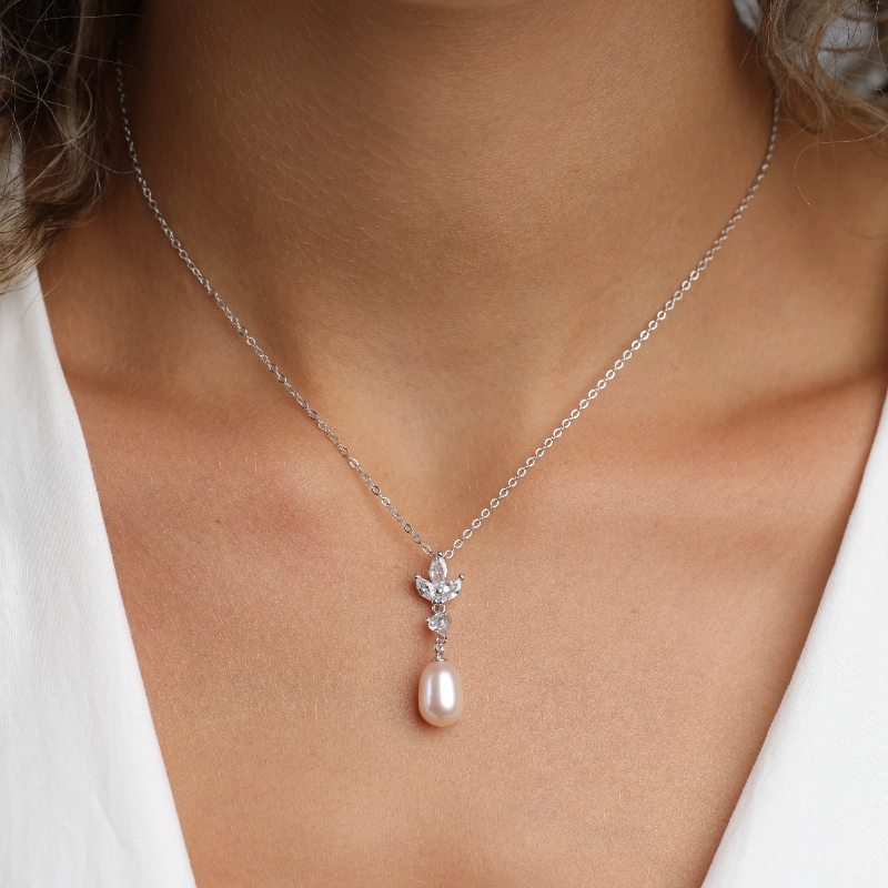 שרשרת נשית ואלגנטית עם תליון פנינה מעודן , המחובר לעלים משובצים אבני זירקון נוצצות . השילוב בין הפנינה הקלאסית והברק היוקרתי של הזירקונים יוצר מראה מרהיב שמתאים לכל אירוע – משימוש יומיומי ועד לאירועים חגיגיים.